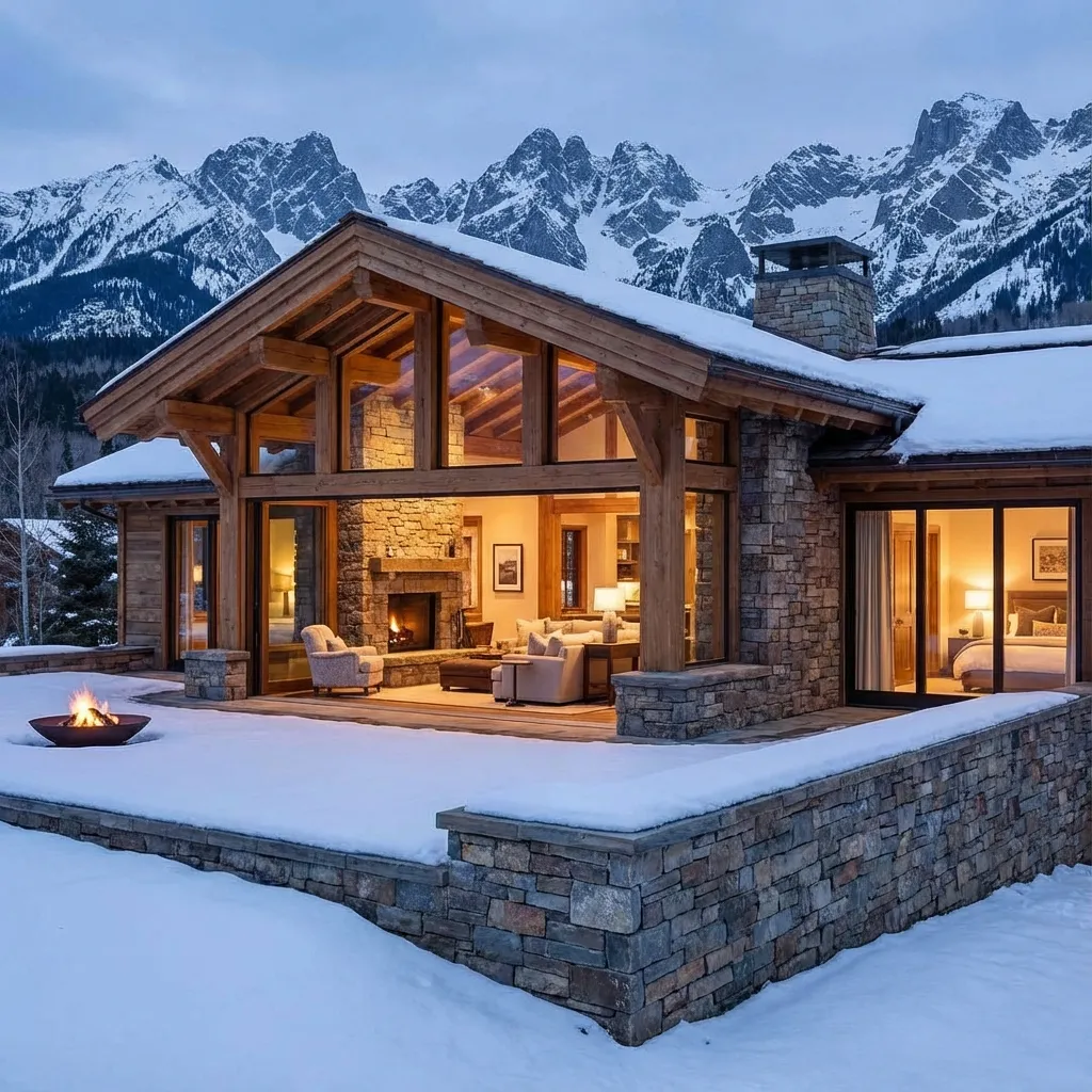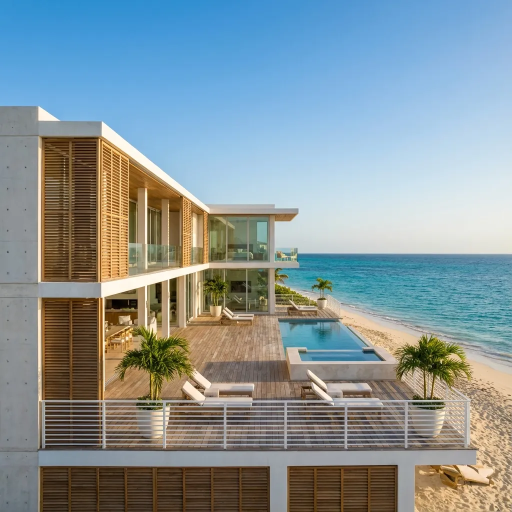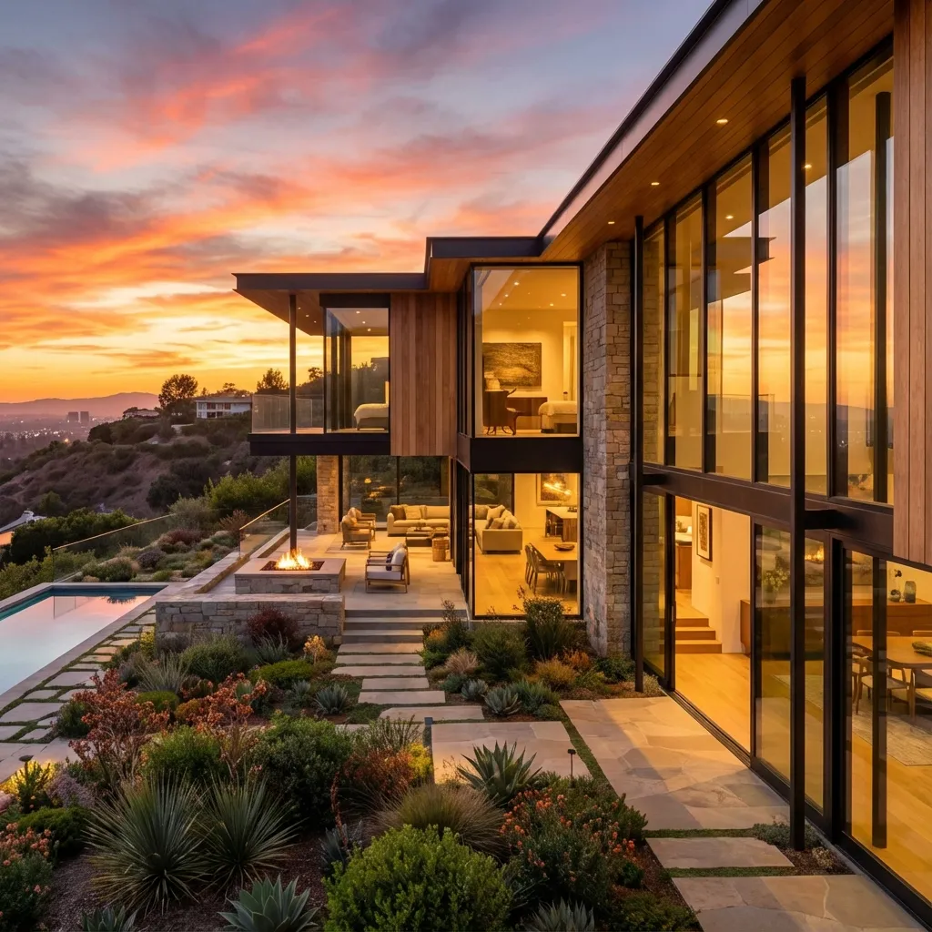 A stunning modern luxury villa featuring a sleek swimming pool, warm wood accents, and expansive glass facades. Designed to blend seamless indoor-outdoor living with a serene twilight atmosphere.