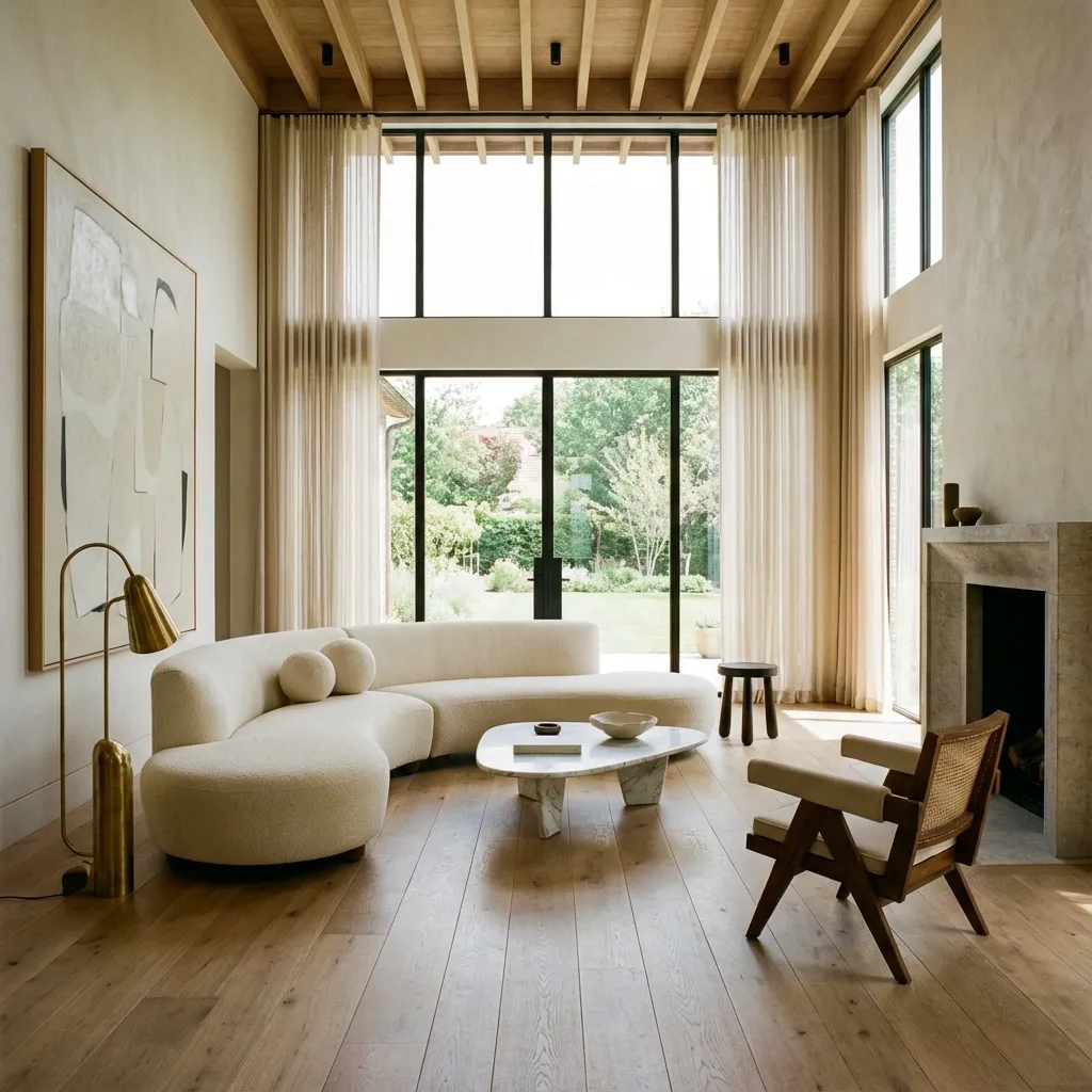 A contemporary living room space focused on comfort and style, with textured soft furnishings, warm wood accents, and optimized natural lighting.