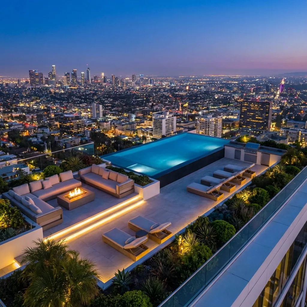 A luxurious rooftop terrace lounge featuring modern outdoor furniture, lush greenery, ambient lighting, and stunning city views. Designed for relaxation and entertainment with premium materials and contemporary aesthetics.